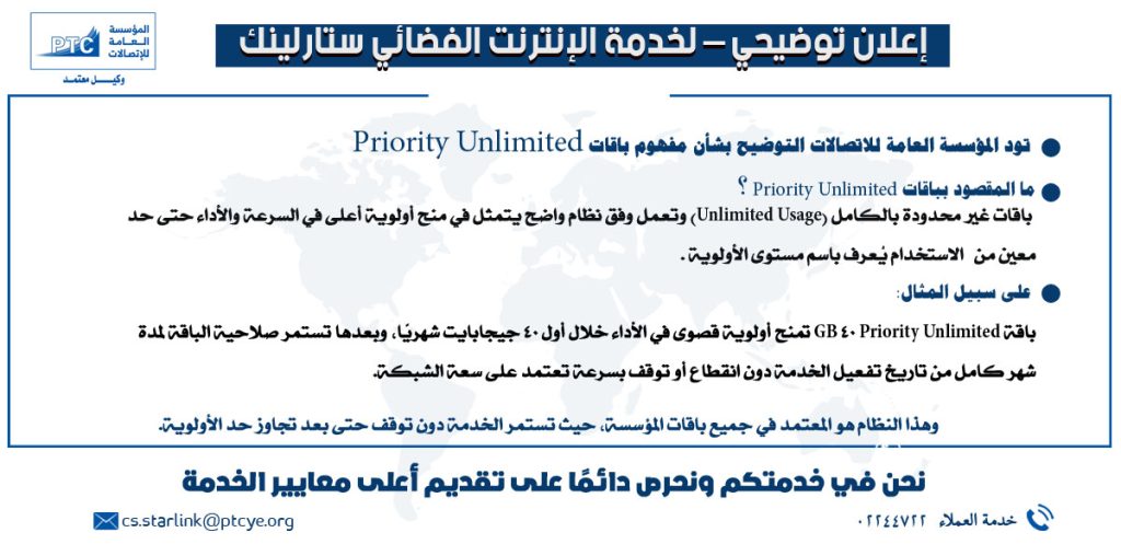 انطلاقًا من حرص المؤسسة العامة للاتصالات السلكية واللاسلكية على تعزيز الشفافية وتوضيح تفاصيل خدماتها الحديثة، وتزامنًا مع تدشين مبيعات أجهزة وباقات الإنترنت الفضائي “ستارلينك” في الجمهورية اليمنية، نود التوضيح بشأن مفهوم باقات Priority Unlimited التي قد يُساء فهمها من قبل البعض.